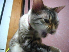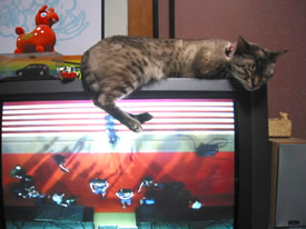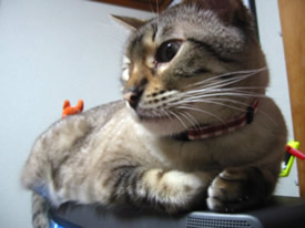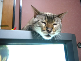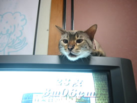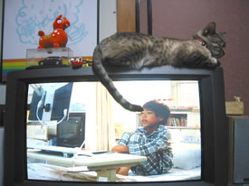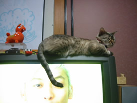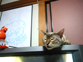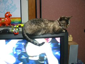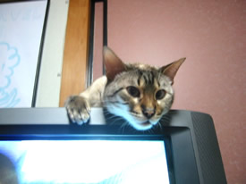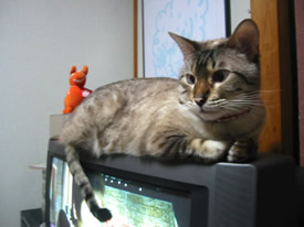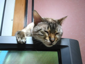 テレビの上がいいのよ。ずっとこっち向いてくれるでしょ?